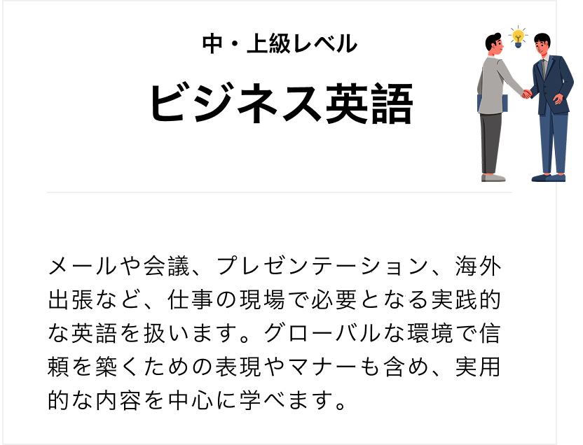 日常会話から、出張や商談で使える実践的なビジネス英語まで、